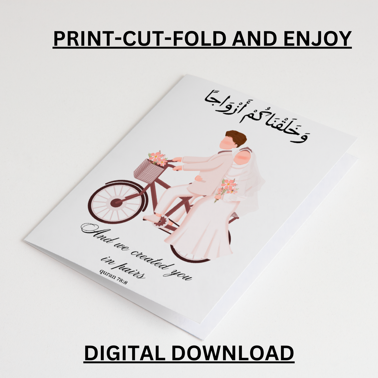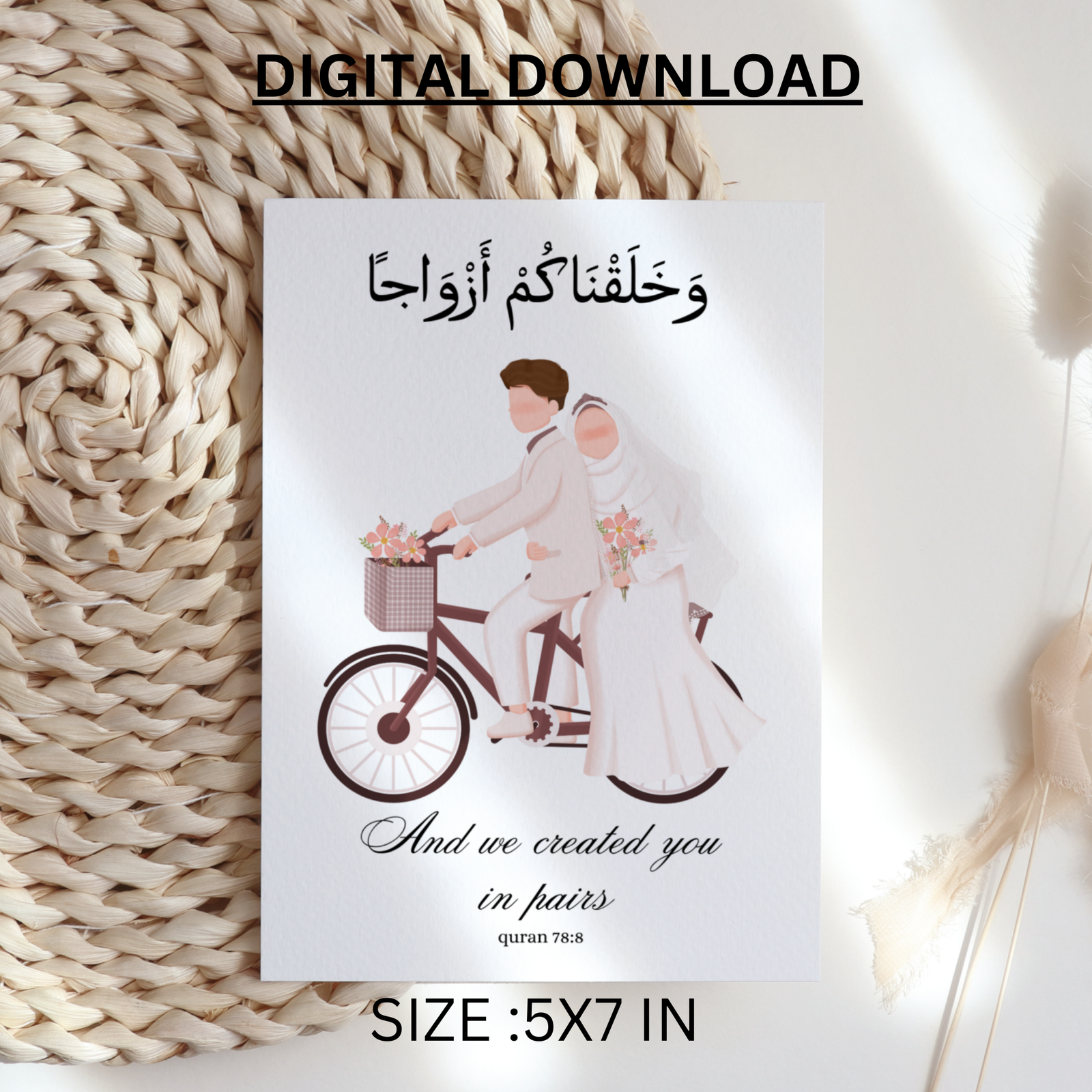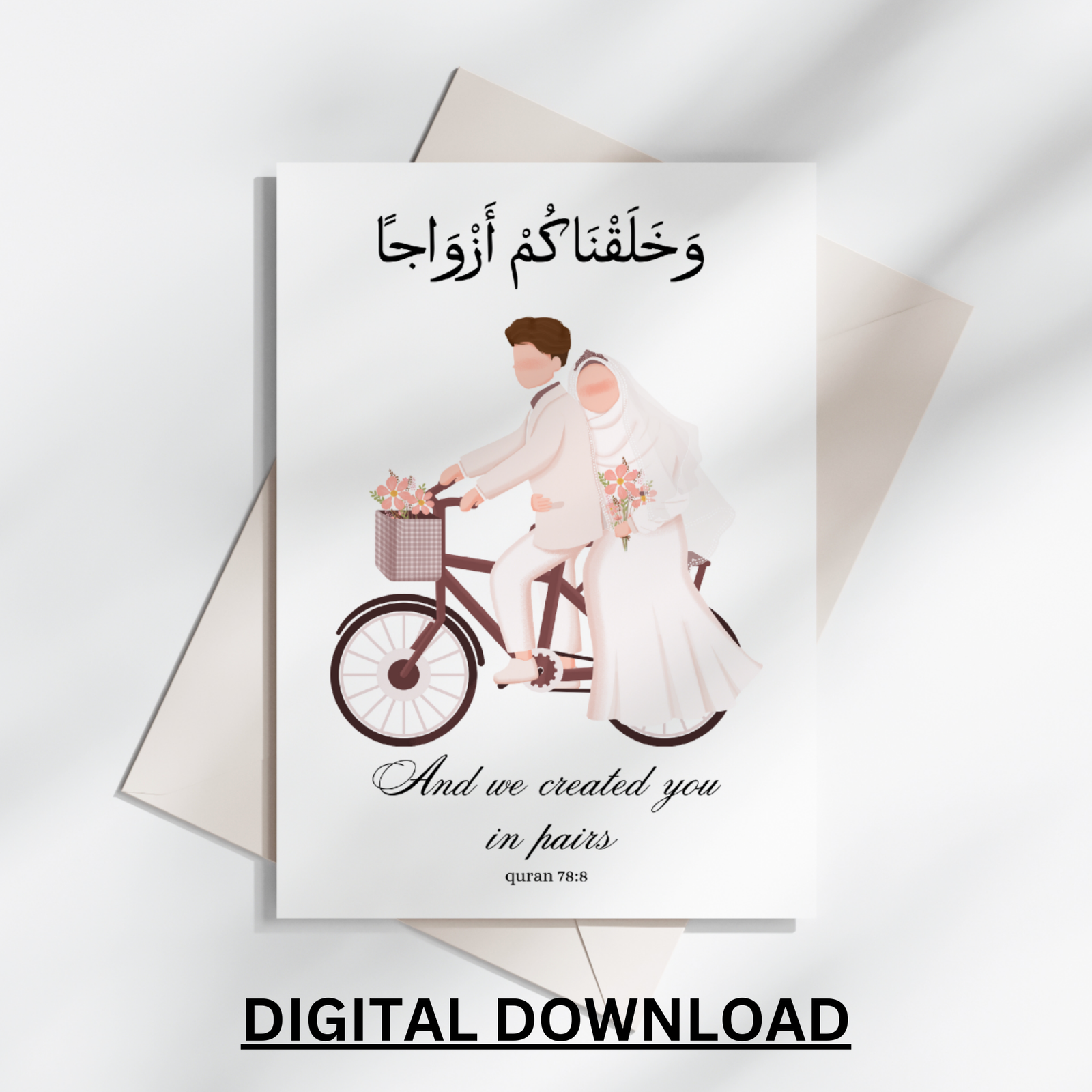 Celebrate love and unity with this beautifully designed Nikkah Wedding Congratulations Card, featuring elegant Arabic calligraphy of the verse “And We Created You In Pairs” (وَخَلَقْنَاكُمْ أَزْوَاجًا). This digital download** is perfect for sending heartfelt blessings to a newlywed couple on their special day.